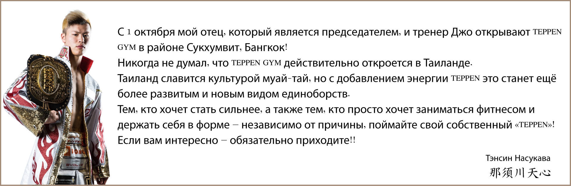 Прямое руководство от тренеров Teppen Gym, которые воспитали Тэнсина Насукаву.